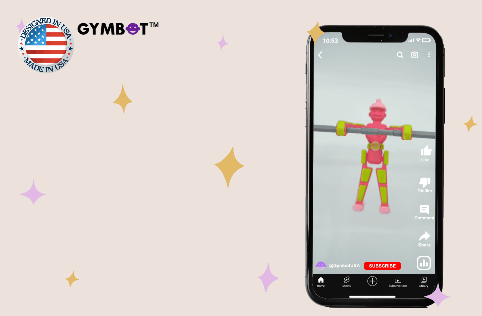 The physics of Gymbot has been carefully calculated using the golden ratio and human body proportions. Parameters such as arm and leg length, body dimensions, and foot size have been adjusted to provide the best visual proportions and optimal functionality. The hooked feet design adds an extra layer of excitement and playfulness. Every element, including the body, belt, and buckle, is designed to provide clearance between the bar and foot.